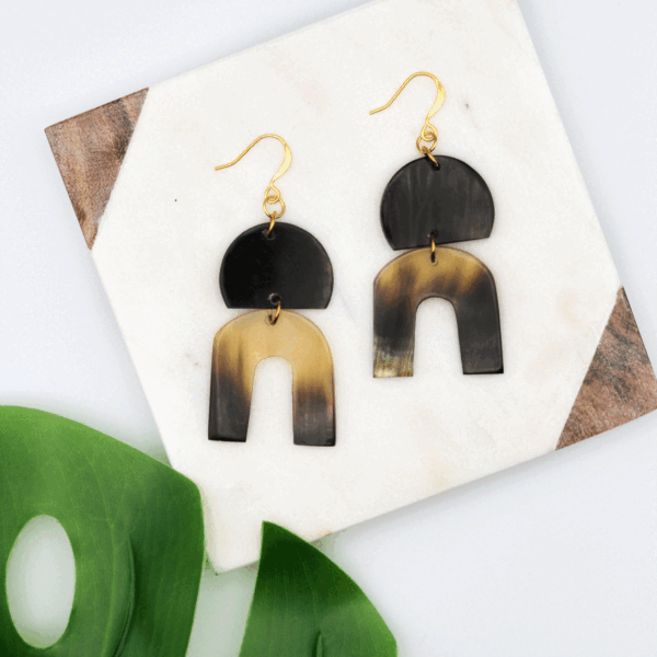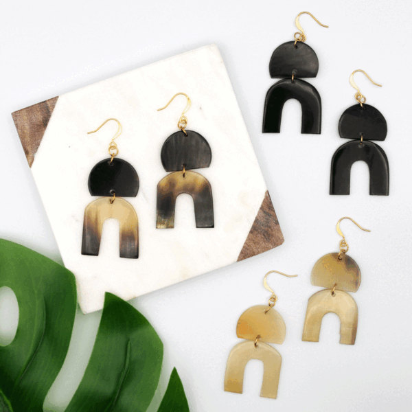 Too cute to pass up!? The Dieuna Earrings feature two pieces of polished horn on a gold plated brass earwire.? Haitian Artisans turn ethically sourced horn that would often otherwise be discarded into beautiful works of art.? No two pairs of earrings will be the same.? When horn is polished. it can take on any color of black. brown. tan or ivory or any combination of these colors.??