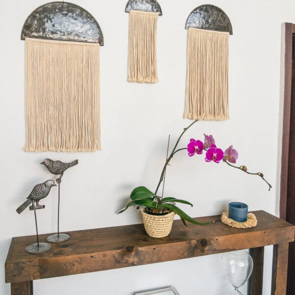 Need to cover a large expanse of wall and want to do so sustainably?? The Metal and Macrame Wall Art Set is made for just that! Haitian artisan. Belony. makes the metal semicircles from recycled oil drums in Haiti. which is then passed along to our talented team member. Gernise. for the finishing touch.? Sold as a set; use all three together. or place in different rooms around your home to add that perfect boho vibe!